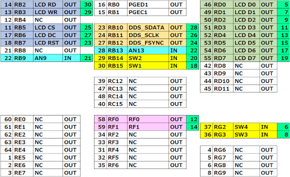 | カラー液晶駆動に沢山のピンを使用していますが、それ以外はDDSモジュール駆動とADコンバータ読み取りがメインになります。 | |