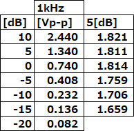| 1kHzの周波数で振幅とdBの関係を実測しました。5[dB]=1.778倍ですからなんとかほぼ正しい比率になっていることが確認出来ました。 | |