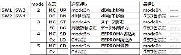 | スイープ測定に関するモードのみ操作方法を追加変更しました。前面パネルのスイッチは上図の左端に表記した順に配置しています。そのレイアウトに従って動作の内容を記しました。これで判り良いかと思います。液晶の左上にも小さく表示していますので、なんとかスイッチ操作に迷うことはないかと思います。 | |