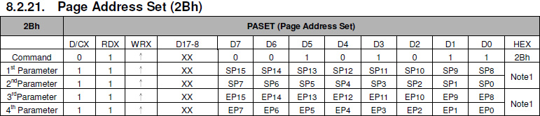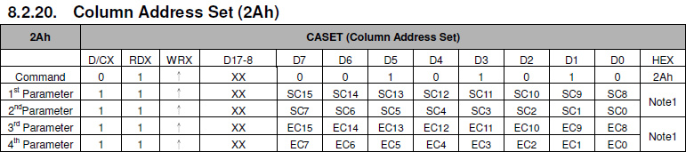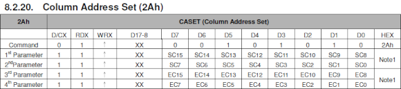 | このコマンドは液晶モジュールのX座標の開始アドレスと終了アドレスを決める設定が出来ます。液晶の方向によって微妙に異なるようなので、都度調整が必要になります。データは00h,01h,00h,80hを設定しています。 | |