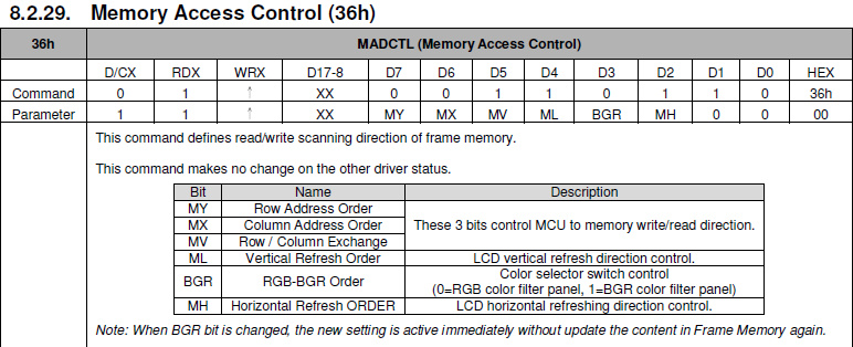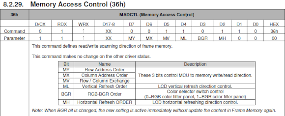 | このコマンドは超簡単に言うと液晶モジュールにどの方向からデータを流し込むかという設定が出来ます。液晶モジュールは向き、というかコネクタの取り出し方向でこのコマンドのデータ内容を変える必要があります。前回液晶モジュールをテストで動かした時はコネクタの向きは右側にありましたが、今回の製作では左側にコネクタを取り出しました。データは68hを設定しています。 | |