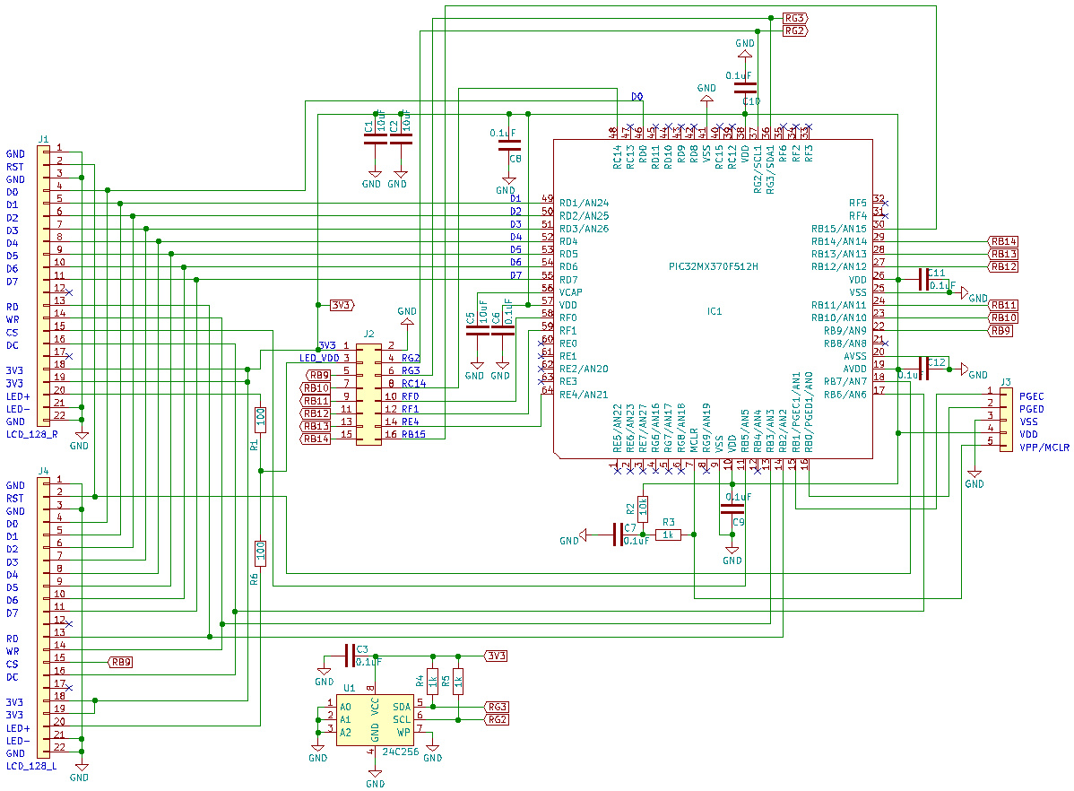 | マイコンにはPIC32MXを使います。液晶のドット数が少ないのでマイコンの選択には迷いますが、高速性とROMサイズから選んでいます。というか、この半導体不足の世の中で購入出来るマイコンは限られています。回路図はこんな感じです。 | |