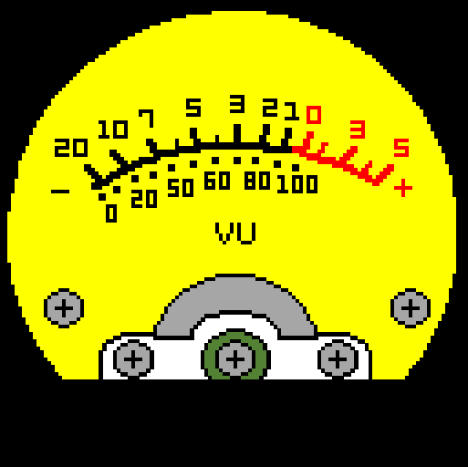 | VUメーターの背景画像はネットで拾ったアナログVUメーターの写真をトレースしてアレンジさせて頂きました。ありがとうございます。128x128ドットの画像なので、なんとか精神が保てるレベルで作業が出来ました。この画像に針の画像を重ね合わせてVUメーターとなります。 | |