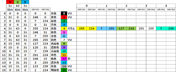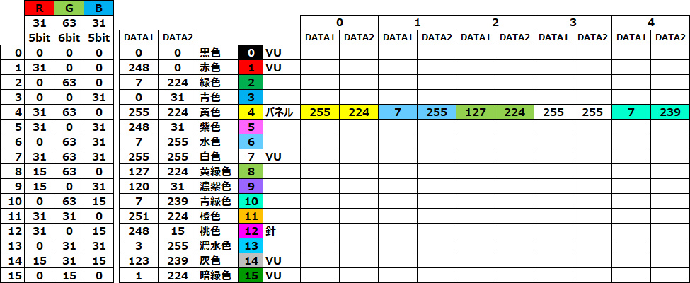 | 画像の色は私の製作で標準に使用している基本の15色を使用します。1バイトで2ドットを表示するために15色としています。今回、メーターの背景の色を変えたいので、基本色の黄色を別の色に割り当てを変えて表示対応しています。メーターなので、あまり変な色を使うと全く見栄えが悪くなるので上図のようになりました。結局7色しか使っておりません。 | |