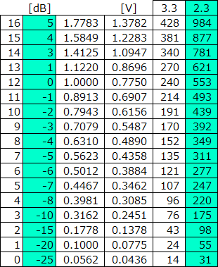 | 上図はオーディオのdB値を電圧に変換した表です。これをPICのADコンバータで有効的に使用出来るように少し変換してから、オーディオレベルの判定を行っています。デジタル的に17レベルに識別して、そのレベルに合った針のデータを背景に重ね合わせています。後ほどプログラムソースを示しますが、容量のほとんどが画像データになっています。 | |