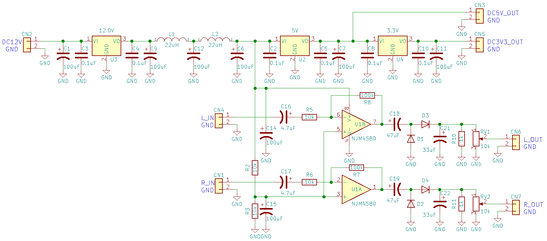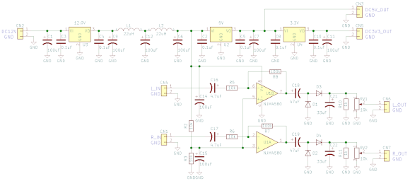| OPアンプ用に12V、液晶のバックライト用に5V、マイコン用に3.3Vの電源回路があります。VUメーターの基本原理は、オーディオレベルを一時的にピークホールドしてVUメータを振らせます。今回はこのVUメータをデジタル的に表現します。ピークホールドされた電圧値をマイコンが読み取り、変換して針のデータとして液晶に表示します。ここで重要になるのが、針のアナログ的な動きです。C21(C22)で一旦蓄えられた電圧はR10(R11)によって徐々に放電されます。針のゆっくりとした動きをしようとして放電抵抗の値を大きくすると、針の戻りが悪くなるので、見ていてちっとも面白くありません。今回は放電抵抗を1kΩとしてそれなりの早い動きになるようにしました。これが本当にVUメーターかと言われると違うかもしれませんが、これくらいの表示が私にはマッチしています。 | |