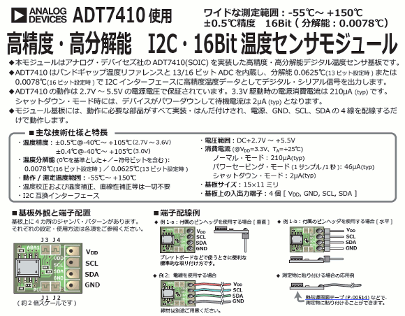 | 同じく秋月で購入した温度センサーです。こちらも極めて安定しています。マイコンとI2C接続します。16bitモードで使用しています。分解能は0.0078℃です。温度だけにかなりシビアに計測しますので、発熱体に近づけると正しい気温が測定出来ないので、設置方法は工夫が必要です。こちらも小数点1桁まで表示させます。こちらも約2秒ごとの測定にしています。 | |