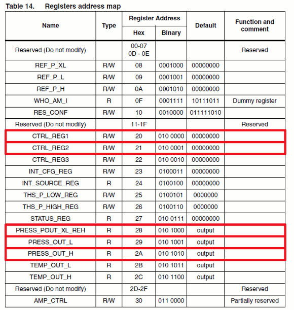 | 詳しい制御方法は後ほどのソースを参照して頂くととして、実際にアクセスするのは上記赤枠の部分のみです。測定間隔は2秒強としています。安定しているので、見ていて安心出来ます。この気圧センサーには温度計も入ってますが、それは気圧補正用と考えて、温度の測定には別のセンサーを使うことにします。 | |