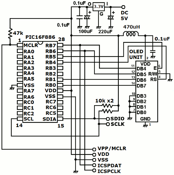 | マイコンは定番のPC16F886を使用します。一度I2Cの制御をマスターすると、後は簡単です。空き端子が沢山ありますが、これは今後の拡張にご期待下さい。気圧センサー、温度センサーとも3.3V動作です。電池駆動も出来ますが、ACアダプター経由する場合は3.3Vのレギュレータを使います。表示は8文字2行のOLEDです。極めて綺麗です。 | |