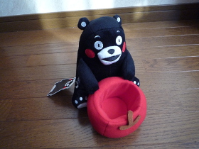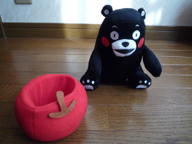 | たまたまですが、ネットでそれらしい大きさのくまモンを見つけて入手することが出来ました。どうやら携帯やスマホを置いておくもののようです。くまモンはりんごを抱えていますのでまずはこのりんごを外します。木綿糸で結ばれているので、はさみであっさり分離出来ました。くまモンをそのまま地べたに座らせると表示の見栄えがよくないので、外したりんごの上に乗せることにします。 | |
