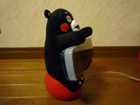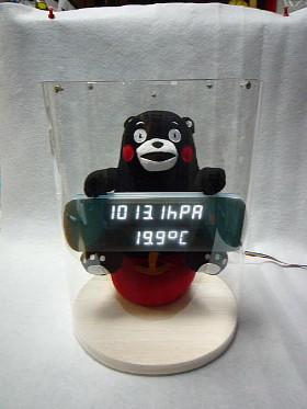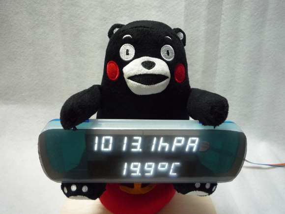 | 前回製作しました「気圧計・温度計」は大変重宝しているのですが、近年の老眼(?)で部屋の端からはとても見える状態ではありません。そこで今回表示を大きくしてみました。ただ単に大きくしただけでは面白くないので、「くまモン」に持たせてみました。こんな感じに仕上げてみました。まずは動画をごらん下さい。 | |