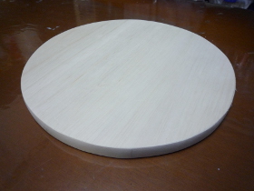 | くまモンを乗せる台を板を丸カットして作ります。のこぎりで切ってやすりで磨いて仕上げます。結構時間が掛かりました。 | |