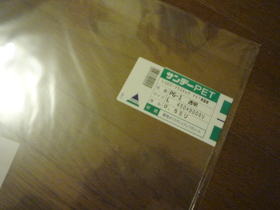 | 台とは両面テープで動かないようします。くまモンの腕も表示部に両面で固定します。ここまで完成度が上がるとくまモンをほこりから避けたくなります。そこでペットのシートで囲いを作ることにします。 | |