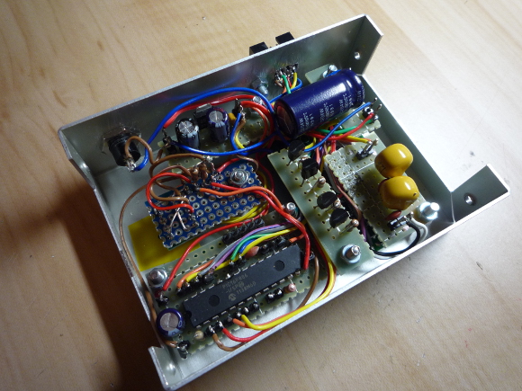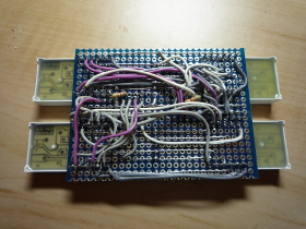 | 上図は8桁分です。今回はこれと同じものがもうひとつ必要です。7セグメントLEDは必ずカソードコモンタイプが必要です。ダイナミック点灯タイプを使うと配線が少なくて済みます。マイコンとの接続は3線です。もうひとセットと電源・GNDを含めてトータル6本の線でマイコンと接続します。表示部は後でデコレートしますので、フラットケーブルなどを用いてマイコン部とは離れて接続するようにします。 | |