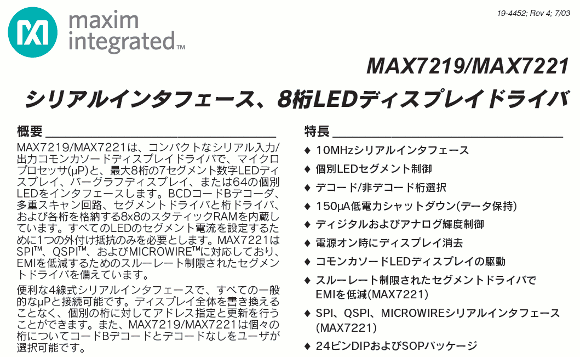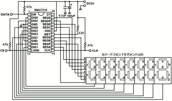 | かなり前の製作で使ったことあるICです。マイコンとはシリアル接続します。ICを制御するだけであとはICが勝手(?)の7セグメントを制御してくれます。セグメントの電流制限はICがしますので外部に抵抗をつけなくていいので配線は楽です。 | |