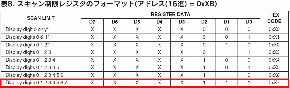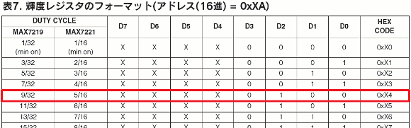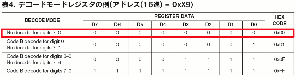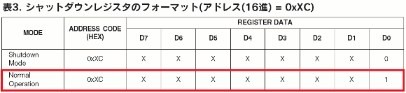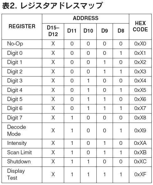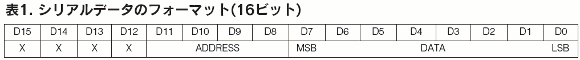 | アドレスとデータでコマンドを送ります。最初の4bitはダミーです。MSBから送ります。制御の詳細はソースと合わせて確認して下さい。 | |