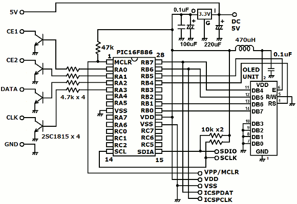 | 従来のマイコン回路の電圧は3.3Vです。今回製作する表示部は5Vです。駆動電圧が異なるので表示部ICへの接続はオープンコレクタとします。表示部で5Vにプルアップしています。制御の理論が逆になりますので、間違わないようにして下さい。 | |