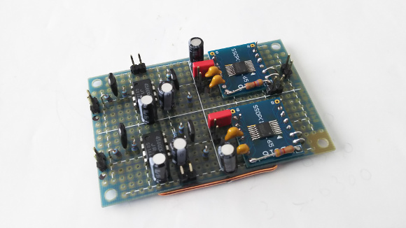 | 今回も製作の最大のポイントはアンプ用ICです。前回と同じくTI製の「LM48100」を使用します。出力は1W程度ですが、5Vで操作してI2Cでボリュームがコントロール出来るのが良いですね。今回はステレオなので2個使用します。I2Cアドレスが2種類設定出来ますのでぴったりです。このICの底面にはGNDパッドがあるので、これを接続する必要があります。 | |