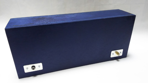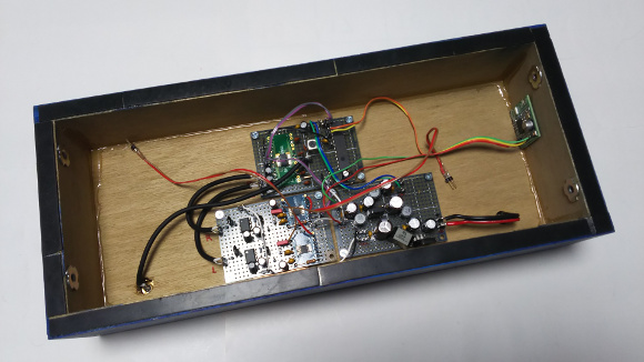 | 大まかな構成はAMラジオと同じです。操作は全てBluetooth経由で行います。ステレオですので、アンプ回路は2系統あります。FMチューナー用のDSPチップは私の定番でありますシリコンラボ製のSi4734を使用しています。私は手元に残っているICを使用しましたが、同じくSi4735も使用可能です。DSPラジオからは少なからず高音帯域にノイズが乗ります。FM放送の質感を損なわない程度にローパスフィルタをかけて聴きやすくしています。今回は青色に塗装しました。車のボディカラーペイントを使うと風格が出ます。 | |