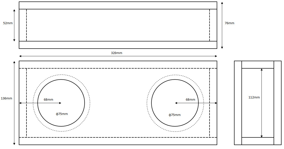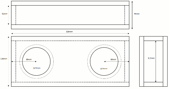 | 今回のケースも12mm合板で作製しました。簡単ですがその図面を示します。各自で合板から切り出して下さい。(図面はクリックすると大きくなります) | |