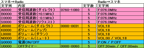 | スマホのBluetoothを経由してPICマイコンに送る信号は5文字の文字列で定義します。スマホのアプリは既に世の中に出回っているものを使っています。PIC側に処理を簡単にするために、全ての操作を5文字に合わせています。ご理解下さい。またラジオ側からも文字列を返すので、スマホ側でもラジオの状態が確認可能になっています。 | |