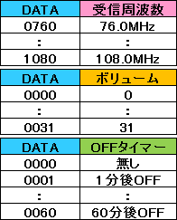 | 受信周波数の設定: 「A」のあとに周波数を4桁の文字列で設定します。受信可能周波数は76.0MHz〜108.0MHzです。最近のAM放送の補完放送も受信可能と思います。0.1MHz単位で設定が可能です。 |