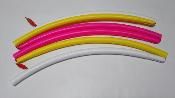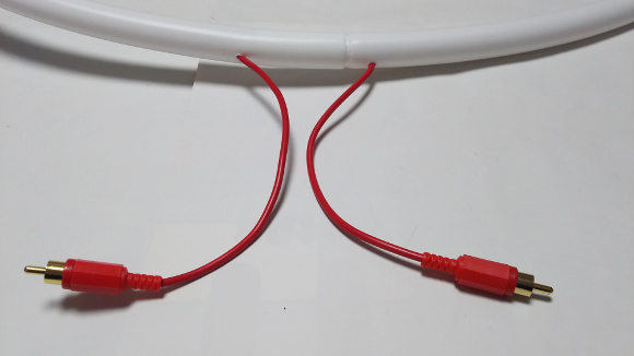 | フラフープを購入しました。6本つなげると、直径が約90cmになるので、円周がなんとか3m弱になります。太めのリード線を購入して、フラフープに穴を開けて、そのリード線を通します。両端に接続端子を取り付けてアンテナの〇部分とします。私は接続端子にはRCA端子を使用しました。GND部分は使用せず、センター部分のみ接続しています。 | |