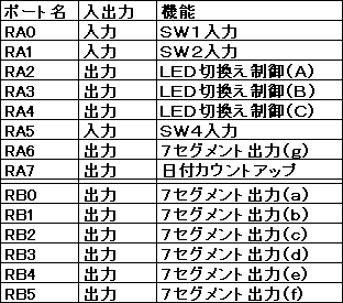 | 日付アップの出力は通常Hレベルとしておき、アップ時にLパルスを出力することにします。簡単に出力するためにLパルス幅は時計カウントアップのタイマーのを利用して0.5秒としました。詳細はソースコードを見て下さい。一応ポートの割付を記しておきます。 | |