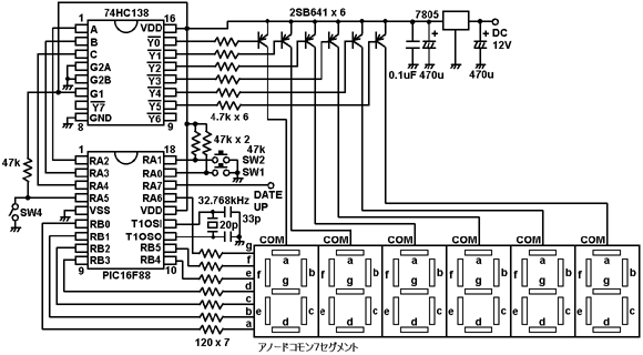 | 全てのポートを使っています。PIC16F88でしか出来ないわざですね。 日付のカウントアップ入力はRB7を使います。 |