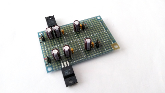 | 今回苦労した部分のひとつです。-5Vを発生するIC:TPS60403は大量のノイズを振り撒きます。いつもはダイセン製の変換基板を使用しているのですが、その場合回路が90度回転しているのでノイズに対して影響が大きすぎることがわかりました。急遽秋月さんより変換基板を購入してマイナス電源部分を作り直しました。電源の入力部分と出力部分にLCフィルターを投入しノイズを撒き散らさないようにすることが出来ました。 | |