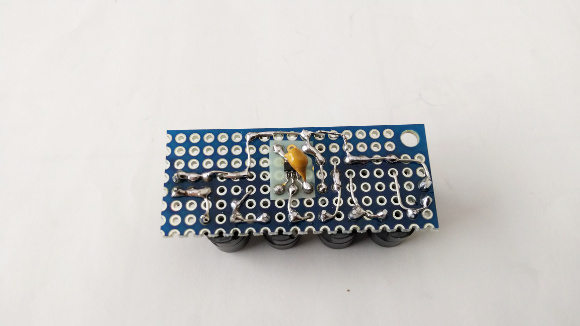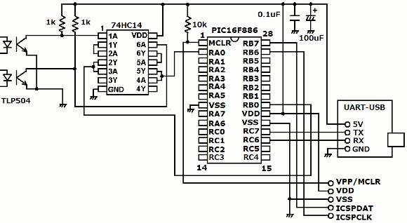 | 昔作った信号アイソレータをそのまま使います。フォトインタラプタで絶縁しています。回路図上でTLP504の部品を使っているところです。オーディオのステレオケーブルで接続出来るようにしています。 | |