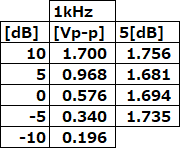 | 1kHzの周波数で振幅とdBの関係を実測しました。5[dB]=1.778倍ですからほぼ正しい比率になっていることが確認出来ました。 | |