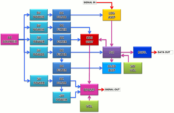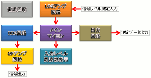 | 正弦波はDDS回路モジュールを使用します。OPアンプを通して出力します。LOGアンプ回路は電子工作の実験室:http://www.picfun.com/を参考にさせて頂きました。この場をお借りして作者の方に感謝いたします。測定データは前回と同じようにPCに接続してグラフを表示します。発振周波数と信号入力レベルはOLEDモジュールに表示します。 | |