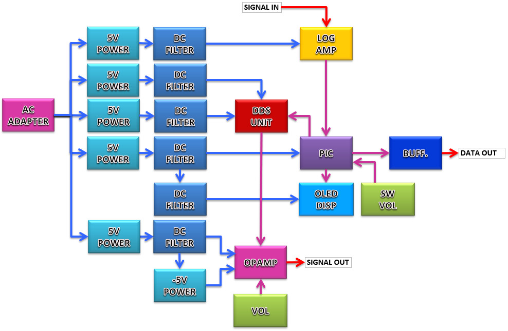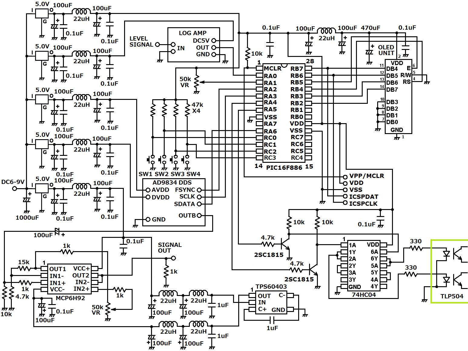 | LOG AMPの回路は載せられませんがAD8310を使用します。この手のICは最近マルツで購入出来るようになったので大変便利ですね。DDSモジュールはAD9834を使用します。モジュールで販売されているものを使用すると便利です。出力のOPアンプはMCP6H92を使用します。帯域の広いものを選択しました。単価は思ったより安いです。OPアンプにはマイナス電源が必要ですのでTPS60403を使用します。簡単に使えて便利なのですが、大量のノイズを発生しますので、電源部を強化しています。 | |