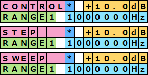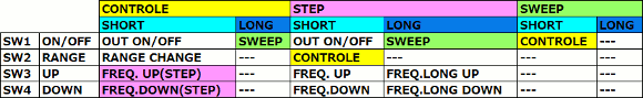 | 「CONROLE」モードからUP/DOWNボタンを押すことで「STEP」モードに入ります。周波数を細かく調整が可能です。最小ステップはレンジによって異なるので上のRANGE一覧表で確認して下さい。 | |