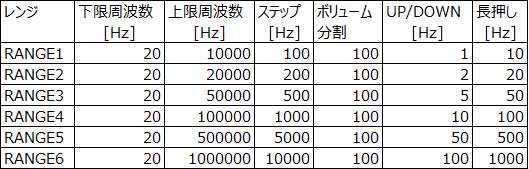 | 「CONTROL」はボリュームで周波数を設定するモード、「STEP」はボタンで周波数をステップアップ・ダウンするモード、「SWEEP」は20Hzから990000Hzまでスイープするモードです。自動で周波数特性を測る時はこの「SWEEP」モードを使用します。 | |