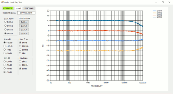 | VBのソフトも前回のものと同じものを使用します。さすがに全ての出力レベルで1MHzまでフラットにはなりませんでしたが、オーディオ用として測定するには充分かと思います。このVBのソフトも上記のURLのページに置いてあります。使いこなしはこれからですが、ひとまずは満足できるものが出来たと思っています。内容的に少し走り書きになりましたが、私の製作例を参考にして皆さんもオリジナルの製作に励んで下さい。 | |