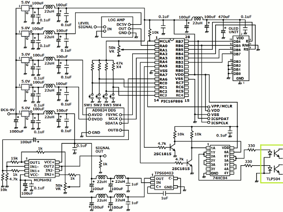 | 電源回路はLCフィルターでノイズ対策をしています。対策し過ぎかもかもしれませんが、電源が安定することで綺麗な波形が出力されることを期待します。メイン制御はPICマイコンで行います。定番のPIC16F886です。 | |