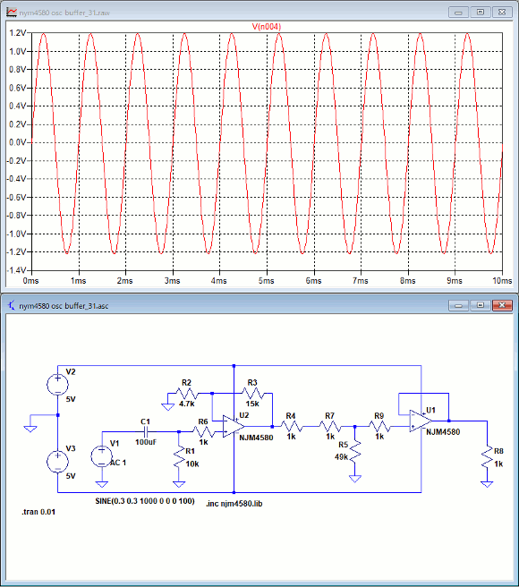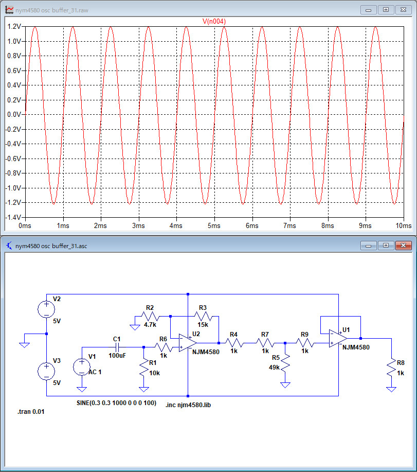 | 実際の回路に使ったOPアンプではありませんが、正弦波の出力回路に間違いがないかを確認するためにLTspiceでシミュレーションしました。ボリューム最大付近で約2.4Vp-pの振幅となりました。シミュレーション上ボリュームの部分はR7,R5で代用しています。ほぼ期待していた通りです。でもここまでの回路に落ち着くまでに結構な日数が掛かりました。私自身もっと勉強が必要と思いました。 | |