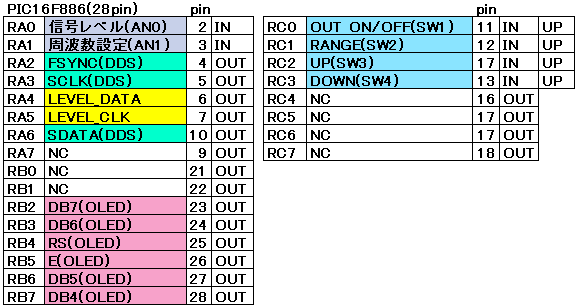 | 周波数のレンジはSW2を押すごとに変化します。ボリュームをマックスにすると上限周波数付近になるようにしています。細かく周波数を調整したい場合はSW3/SW4を押して調整して下さい。オーディオ回路の特性を「SWEEP」以外で測定する時はRANGE2を使用すれば良いと思いますので、その場合は2Hzステップで周波数の調整が可能です。バンドパスフィルタなどの特性を細かく測るときに重宝すると思います。まあ、皆さんが使い易いようにPICのソフトを改良して頂いて構いません。 | |