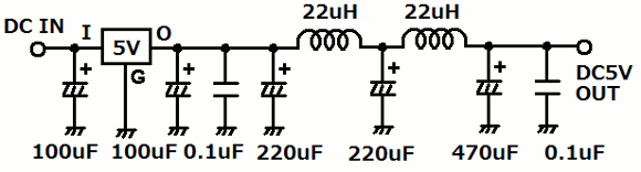 | 電源はトランス型のACアダプター(出力6V〜9V程度)を使います。5Vに定電圧化した後、電源フィルターを通してDDコンバータ基板に接続します。接続箇所は基板上のUSBコネクタの電源/GND端子がベストと思います。 | |