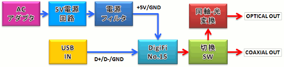 | PCのUSBコネクタからはD+/D-/GNDのみを接続して、電源は外部よりフィルタを通して供給します。同軸デジタル出力を光デジタルに変換する部分を新作して合体します。 | |