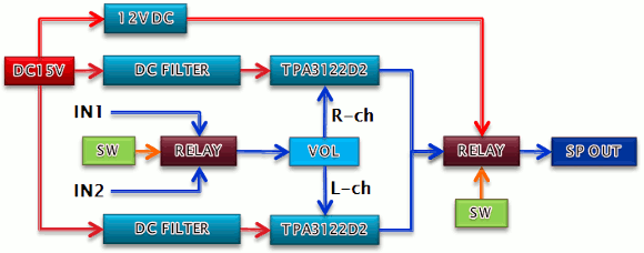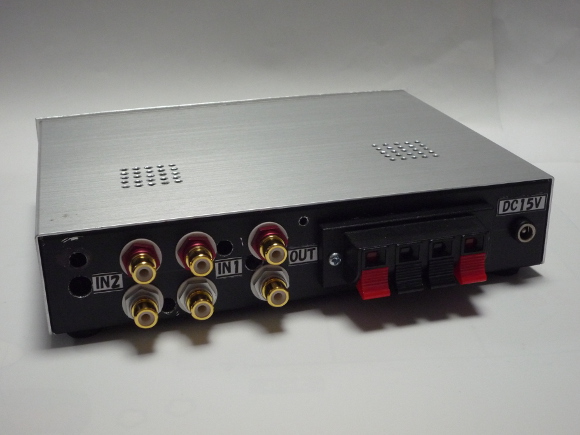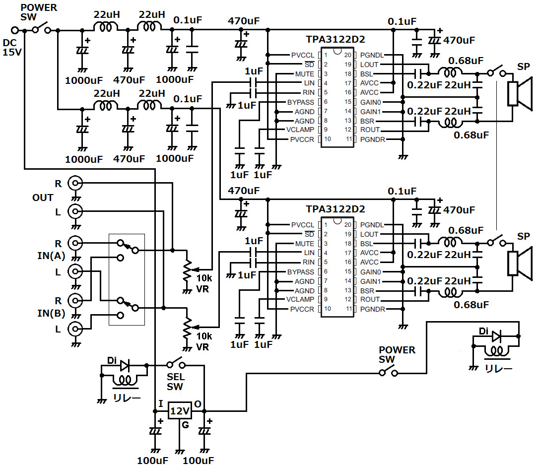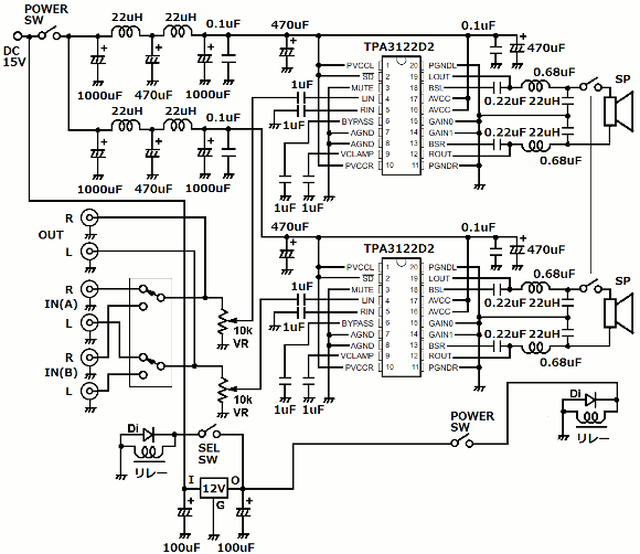 | 入力系を2系統設けています。切換えスイッチでリレーを切換えて入力を選択しています。リレーを入力部付近に配置することで、切換えのロスを無くしています。電源回路のフィルターはL/R用それぞれに独立させました。電源周りからのノイズを極力抑えています。アンプICはBTL接続で使用していますので、基本的に電源ON時のポップアップノイズは発生しません。しかしながら電源OFF時にボツ音が発生するので、それを防ぐためにスピーカーをリレーでON/OFFしています。電源スイッチは2系統が同時にON/OFF出来るものを使用します。アンプICにはDC15Vを想定していますが、IC的にはもっと高い電圧でも使用可能です。但し、切換えに使用するリレーはDC12Vをタイプを使いますので、12Vのレギュレータで定電圧化しています。リレーは大電流が流せるパワーリレーを使いました。入力ボリュームはオーディオ用の高級品を使いました。 | |