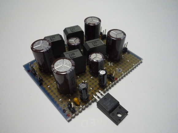 | 電解コンデンサは低インピーダンス品を使用しています。コイルは大電流の流せる大き目のサイズのものを使用しています。リレー用のDC12V回路は至ってシンプルです。 | |