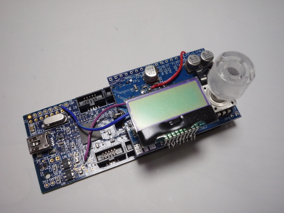 | ロータリーエンコーダのノブがかなりの高さがあるので、液晶を基板から浮かせて配線しないと、ノブとのバランスが悪くなります。好みだとは思いますが私は上図のように取り付けしました。 | |