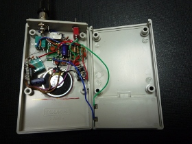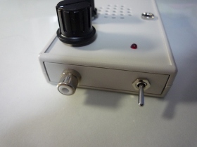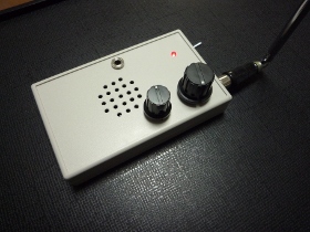 | 1)FMラジオはSilicon Labo製Si4831のDSP処理チップを使用します。 2)選局はボリューム操作で行います。回転角と周波数が直線的に対応しますので高い周波数の選局が比較的楽です。同調するとLEDが点灯します。 3)モノラルアンプとスピーカーを内蔵しています。 4)単3電池2本で動作します。 |