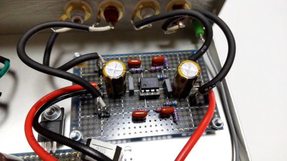 | フォノイコライザーの回路図は雑誌掲載回路をそのまま使わさせて頂いておりますので、ここに載せることは出来ませんが、OPアンプ1個のシンプルなタイプです。基板上に沢山の抵抗が並んでいますが、ピッタリの抵抗値が無かったので、複数個を直列にしています。 | |