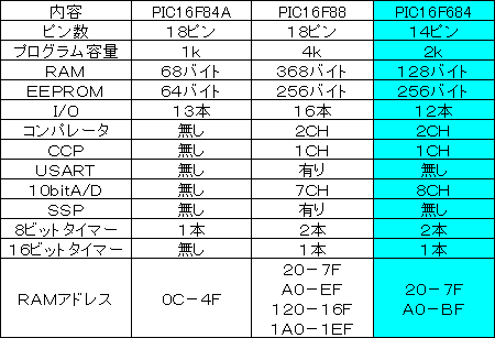 | 今まで18ピンのPICに見慣れていましたので大変小さく感じました。 ポート数は限られますがA/Dコンバータもあり大変使い易いと思います。 初めての方もおられると思いますので他のマイコンとの比較をしておきます。 |