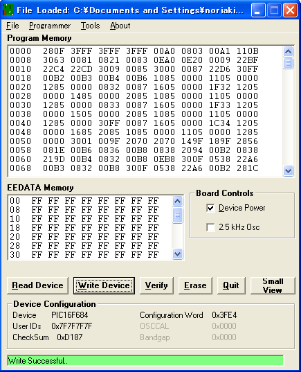 | デバイス設定は特別にはありません。「Read Devide」することによってボードに差し込んであるPICの自動判定を行います。専用ツールですので簡単に使用出来るようになっています。 |