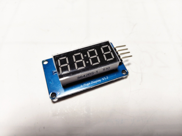 | そもそも今回の企画はAmazonで下写真の7セグメント4桁の表示セグメントを発見したことから始まりました。3.3Vでも動作するみたいだし、制御がシリアル通信で出来るところが気に入りました。表示輝度も変えることが出来ます。追加した部品の配線は基板のパターンから直接行っています。 | |